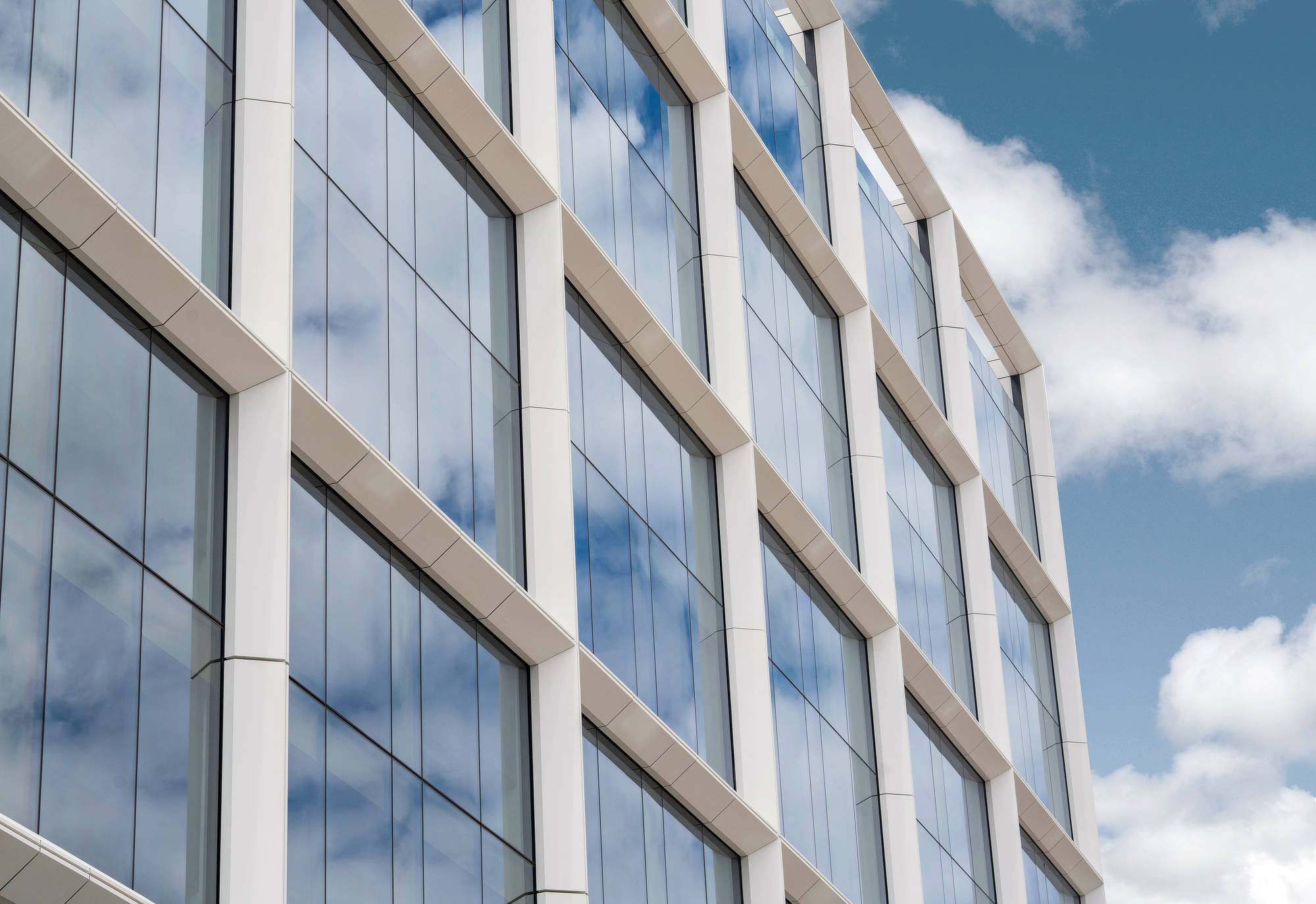 The building’s facade includes a masonry-like projecting cruciform at every second level, which extends over the roof-level to form a grid-like shell.