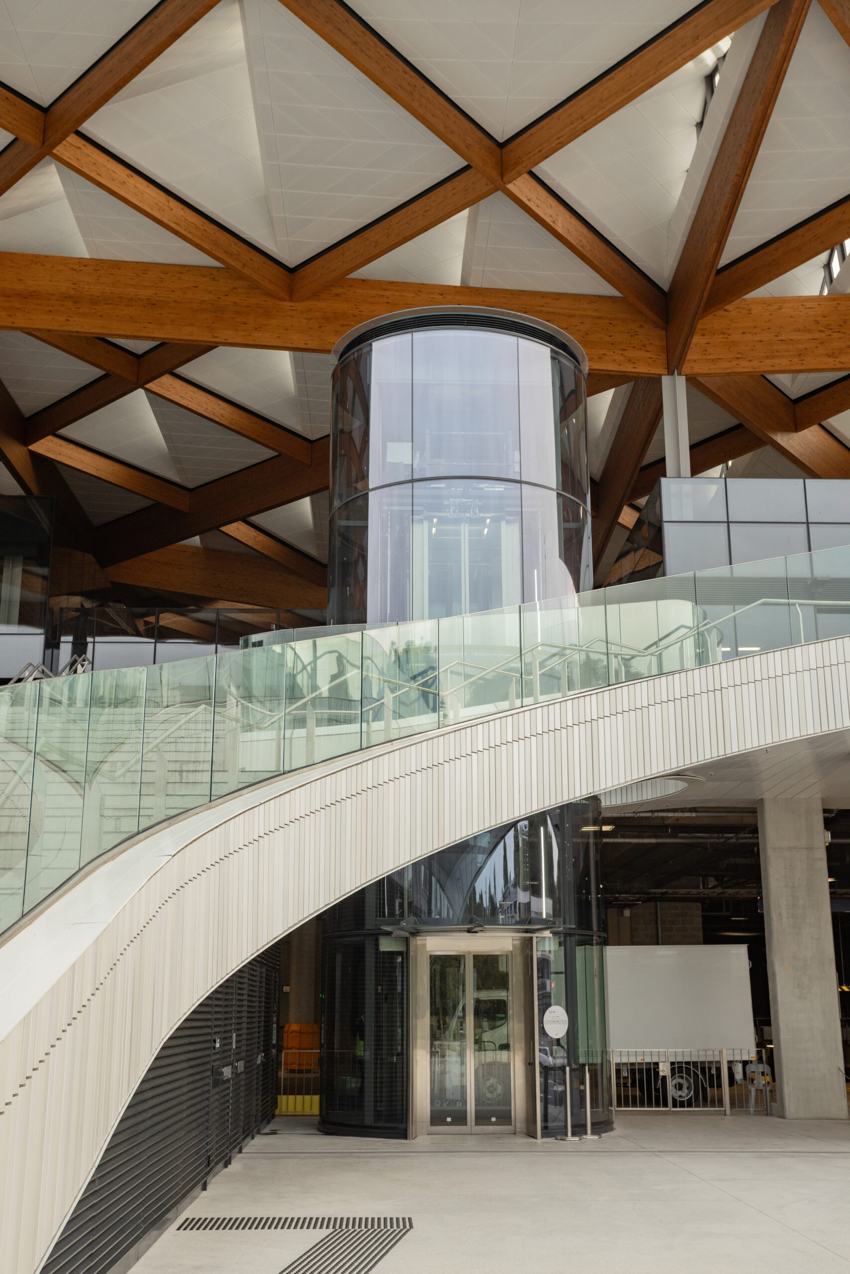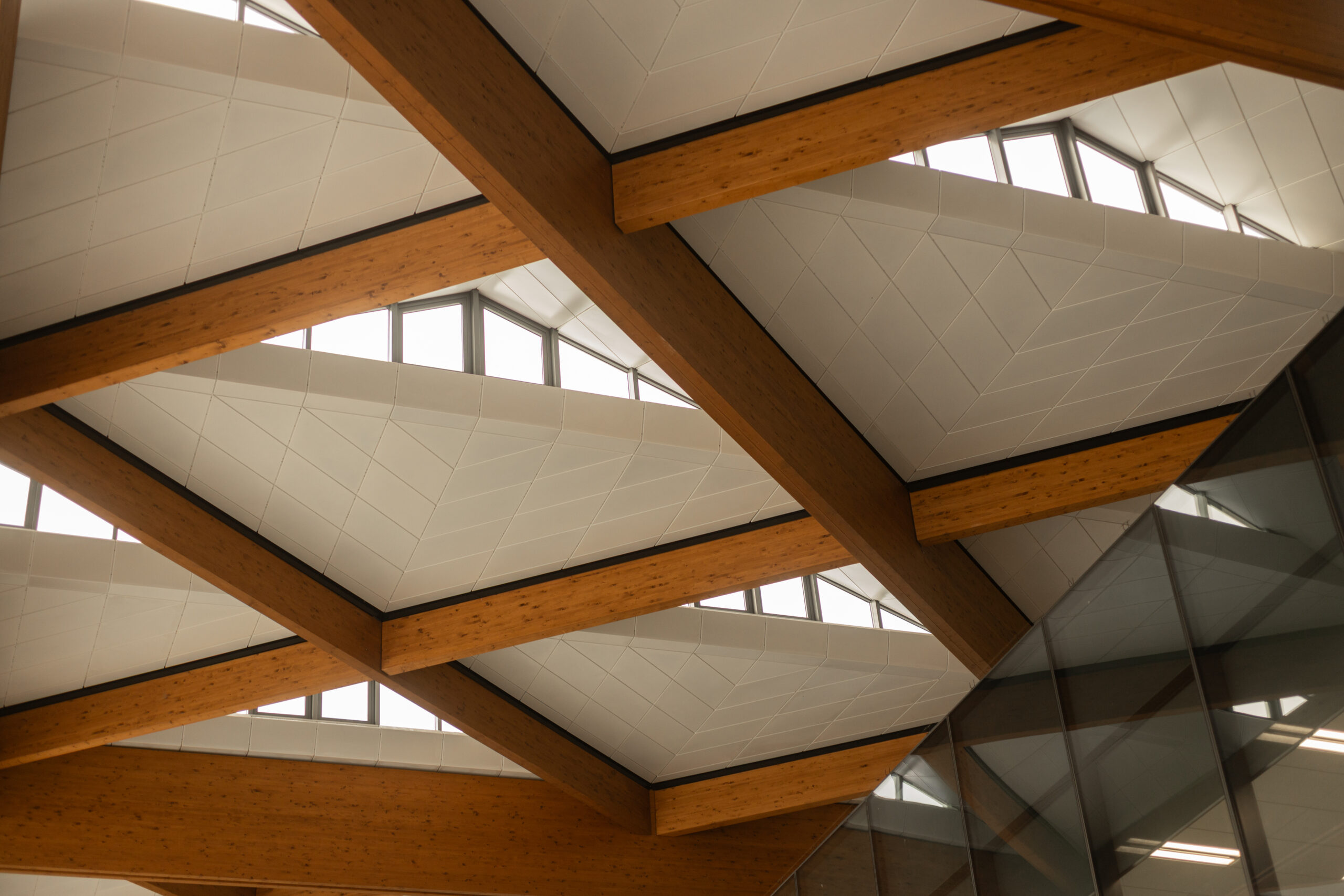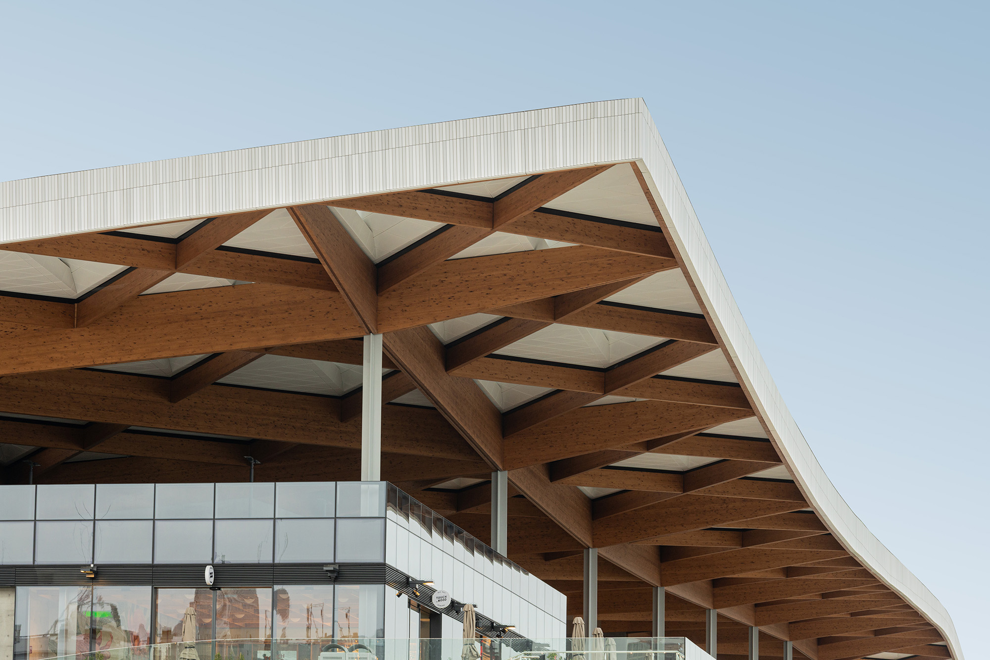 Comprised of prefabricated cassettes forming the pyramidal shapes, the roof design accommodates the varying geometry and movements of the timber, and allows for thermal expansion and contraction evenly across the very large spans of the building. The key to the roof cassette design is the four-way connections at each of the four-way junctions in the timber, which transformed the installation methodology, allowing the panels to be installed from underneath.